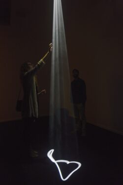 Vous pourrez ainsi découvrir Netykavka (2013) de Dan Gregor jusqu’à la fin de l’année. Cette installation de l’artiste tchèque Dan Gregor vous plongera dans une grande salle sombre où la fumée fait apparaître un faisceau lumineux sculpturel. Cette forme spectrale oscille de façon presque imperceptible et vous invite à dialoguer, tenterez-vous de la toucher pour entamer la discussion ?