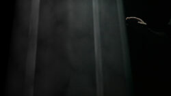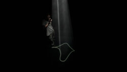 Dans une salle sombre s’inscrit au sol une figure géométrique, en vidéoprojection. Cette forme oscille légérement, de façon presque imperceptible. Mais, ce qui interpelle surtout le spectateur, c’est le cône lumineux formé par la lumière qui sort du projecteur, qui épouse et accompagne les ondulations de la forme au sol. La lumière acquiert sa matérialité grâce à la fumée, diffusée parcimonieusement dans la pièce.